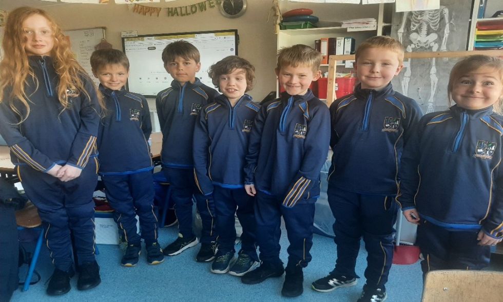 Our track suit is crested – the crest was designed by a pupil in our school Ms Ella Wilkinson Crowley who designed the crest with the themes of Spirit, Education, Spot in mind. Ella was in second class when she designed the crest. Well done Ella.